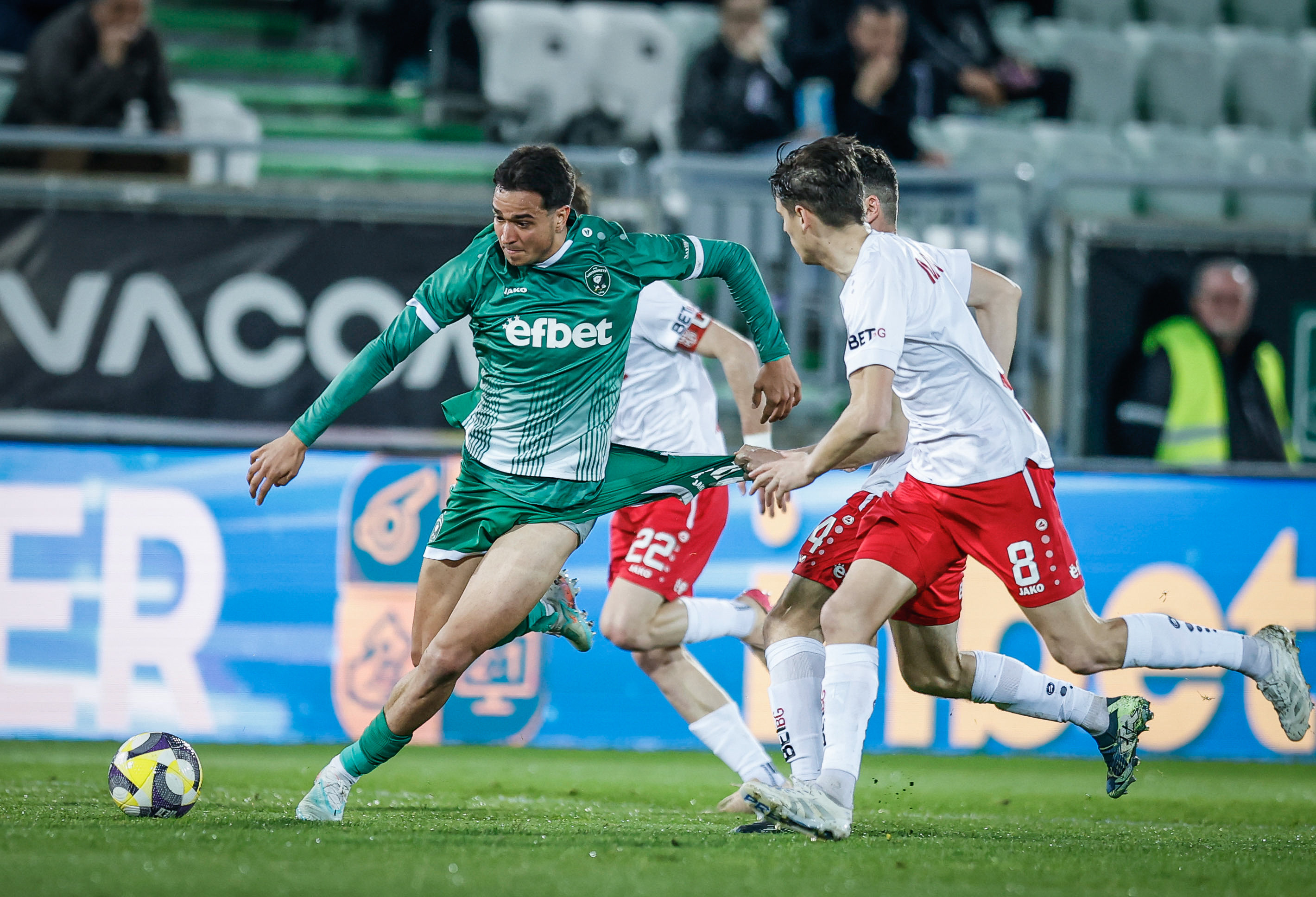 Ключовият момент през първата част настъпи малко преди почивката. В 41-ата минута десният бранител на домакините Йоел Андерсон бе фаулиран в наказателното поле от Петър Витанов, който влезе на шпагат. Първоначално главният съдия Стоян Арсов остави играта да продължи, но след като бе привикан от ВАР да преразгледа ситуацията на монитора, реферът категорично посочи бялата точка. Зад топката застана Квадво Дуа, който хладнокръвно реализира отсъдената дузпа, давайки аванс на „орлите“ – 1:0.